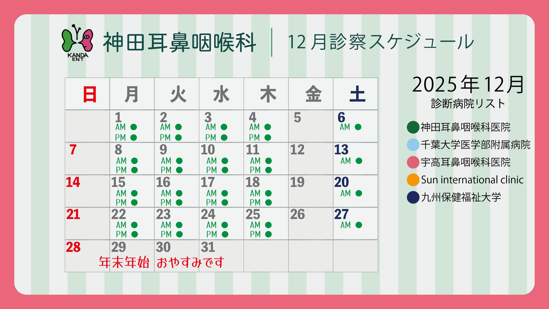 | 予防接種 | インフルエンザ予防接種 新型コロナウイルス予防接種 |
