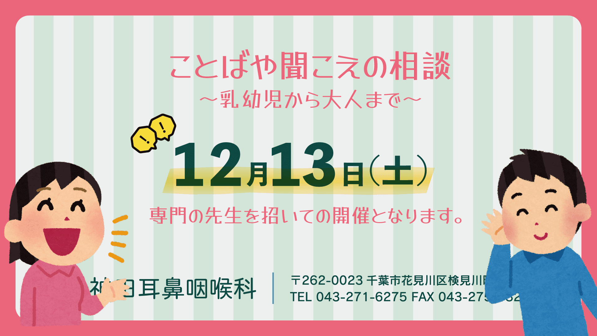 聞こえやことば、コミュニケーションに関係する言語・聴覚障害全般、および嚥下機能に関する診療を、言語聴覚士と医師が共同で行います。詳細は医院まで直接お尋ねください。【注意!予約数が限られているため、現状ではスタッフのみが操作しています。いずれ患者様からの予約が可能になりますが、当面は、皆様からの入力は予約として成立しません。申し訳ありません。】